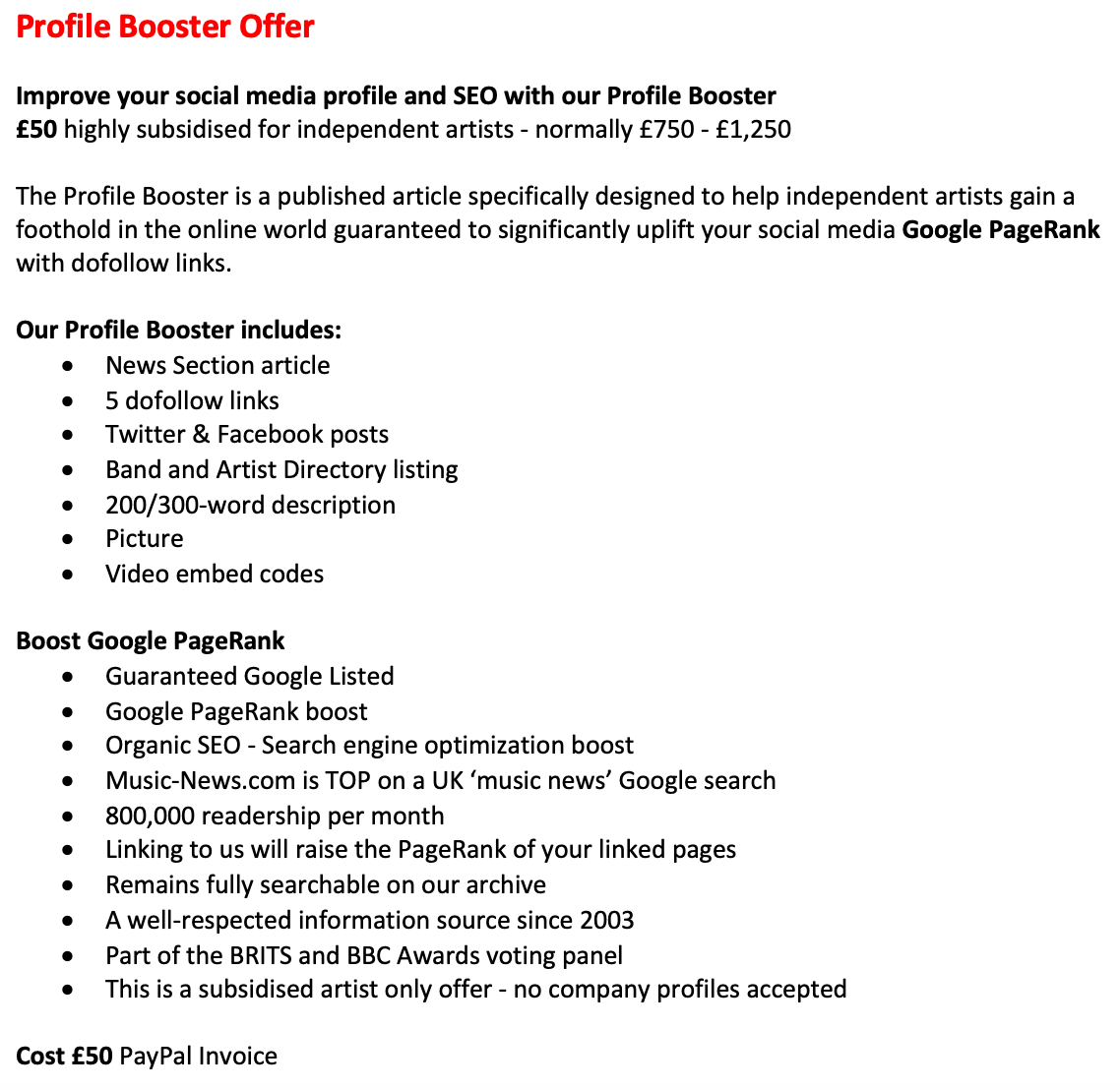 “Music News gave Scouting For Girls our first review and it was a good one! A well needed boost right at the start of our career."The Profile Booster is essentially a directory listing containing a short biography and all contact info.